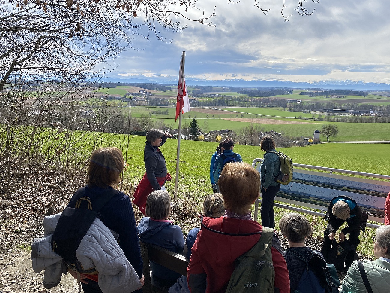Zuerst ging's zum Panoramablick westlich des Ortskerns und dank gutem Wetter war auch wirklich die gesamte Alpenkette zu sehen. Ein erster Input zu Frauenrechte in Theorie und Praxis weltweit und bei uns in Österreich eröffnete die inhaltliche Auseinandersetzung mit dem heutigen FrauenWander-Thema. Über den Symphonieweg ging es wieder zurück zum Marktplatz und zum Mittagessen.